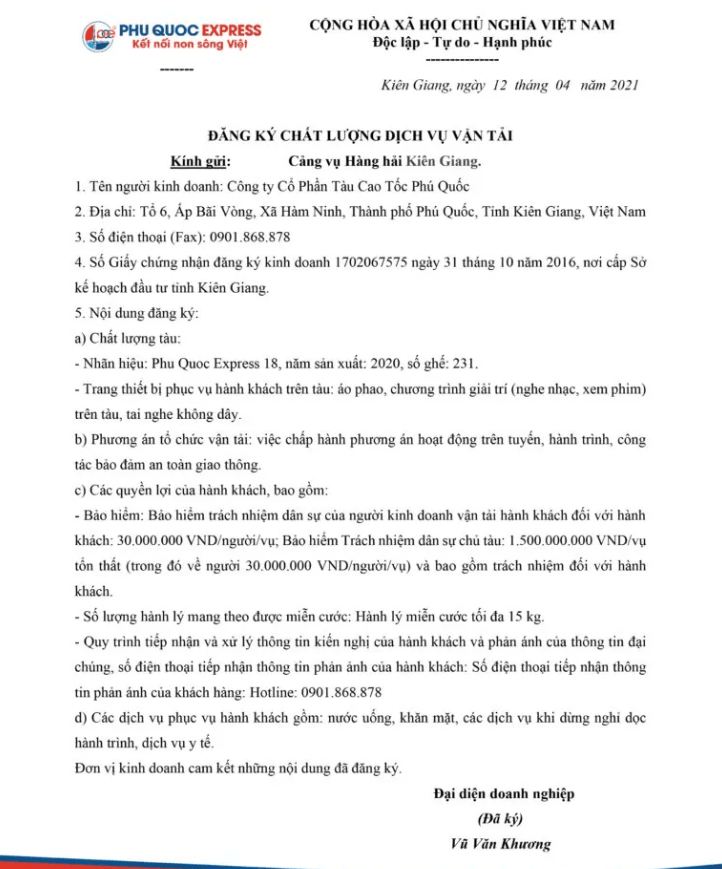 Dưới đây là đăng ký chất lượng dịch vụ của tàu Phú Quốc Express 18: