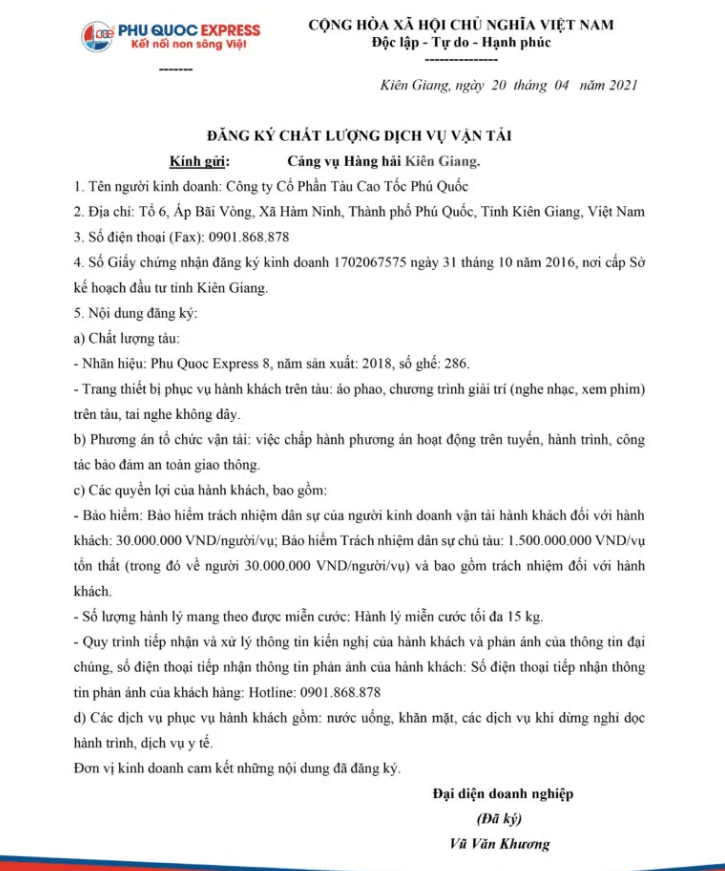 Dưới đây là đăng ký chất lượng dịch vụ của tàu Phú Quốc Express 8: