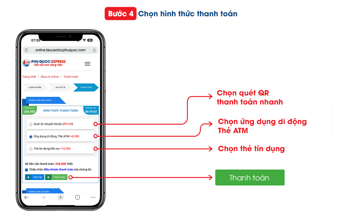 Tiến hành thanh toán vé tàu Hà Tiên đi Phú Quốc theo các cách sau: quét mã QR, sử dụng ứng dụng di động, thẻ ATM, thẻ tín dụng hoặc ví điện tử. Tất cả giao dịch thanh toán tại Phú Quốc Express đều được đảm bảo bảo mật qua cổng thanh toán OnePay.