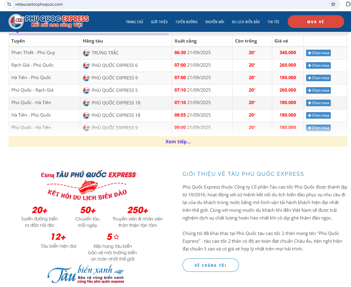 - Chọn nơi đi (Ví dụ: Hà Tiên, Rạch Giá) → nơi đến (Phú Quốc).
