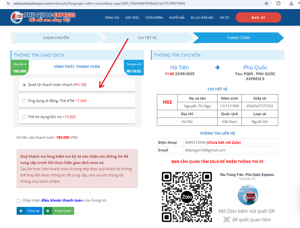 Cách 1: Đặt vé tàu Hà Tiên Phú Quốc qua zalo