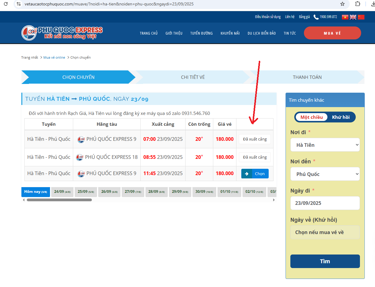 Bước 1: Chọn lịch trình tàu tại: https://vetaucaotocphuquoc.com/ hoặc https://vetaucaotocphuquoc.com/ha-tien-phu-quoc/ để mua vé.