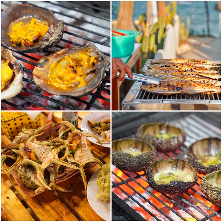 Tối đến tụi mình ghé chợ đêm Phú Quý ăn hải sản: sò điệp nướng mỡ hành, cua Huỳnh Đế, cá mú hấp cuốn bánh tráng… Giá rẻ và tươi ngon bất ngờ.