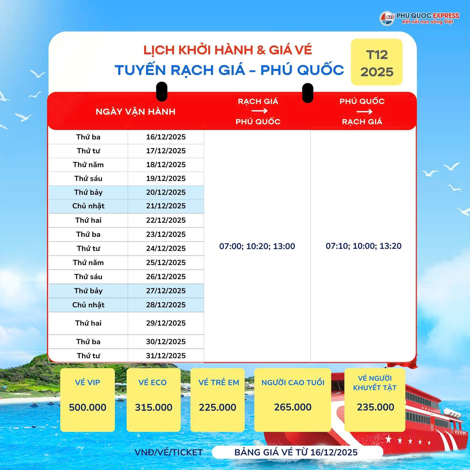 Taucaotocphuquoc xin thông báo tới Quý khách hàng lịch chạy tàu Rạch Giá - Phú Quốc tàu Phú Quốc Express 12/2025.