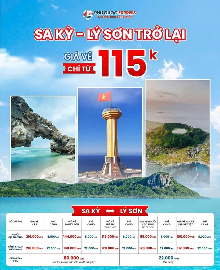 Vào sáng thứ 6, ngày 17/04/2026, Phú Quốc Express 27 sẽ chính thức thực hiện chuyến hải trình đầu tiên từ Sa Kỳ đi Lý Sơn. Đây là cột mốc quan trọng, mở ra lựa chọn mới cho du khách muốn khám phá vẻ đẹp hoang sơ của Lý Sơn trên những con tàu vỏ nhôm giảm thiểu say sóng, động cơ Rolls-Royce và không gian nội thất đẳng cấp.